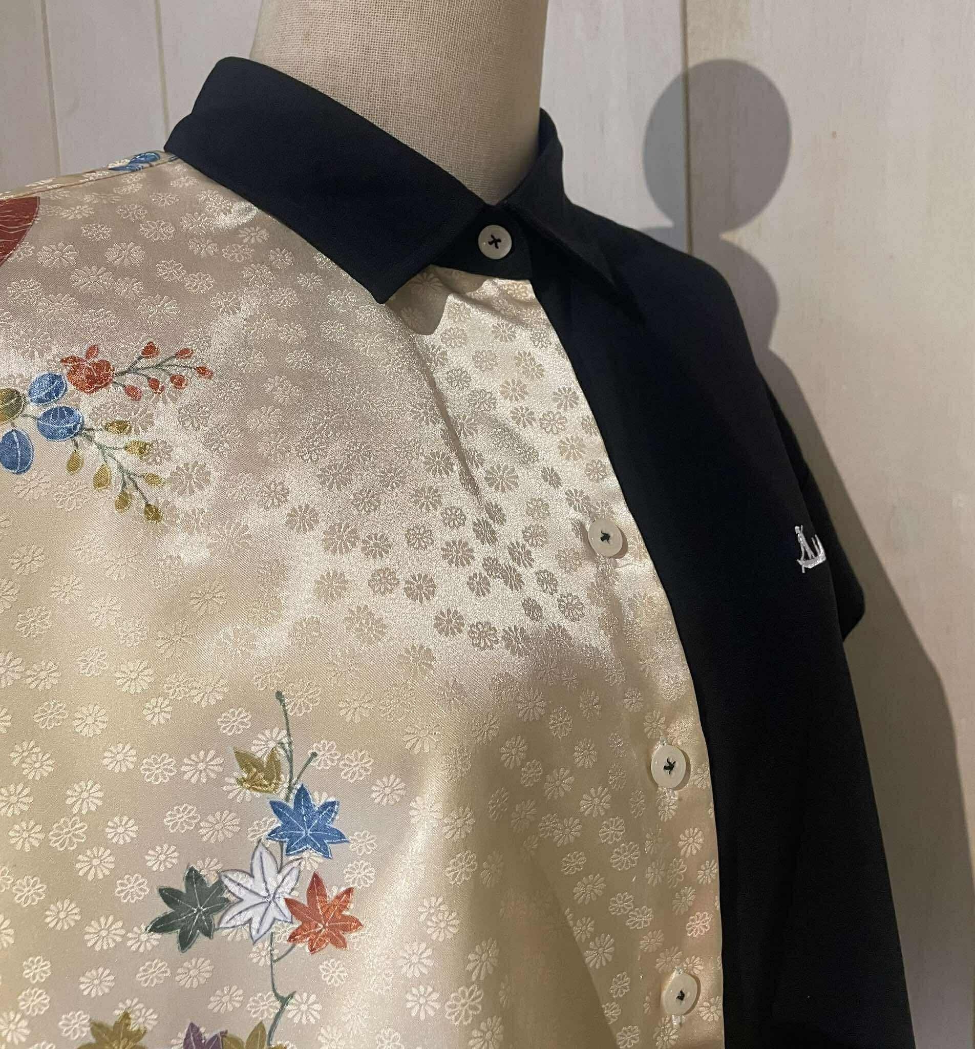 【SAMURAI Shirts for Women】世界にひとつ、着物が旅するシャツ(S/M)|四季花に紅葉(もみじ)文 ×テーラーメイド by SuiJoh